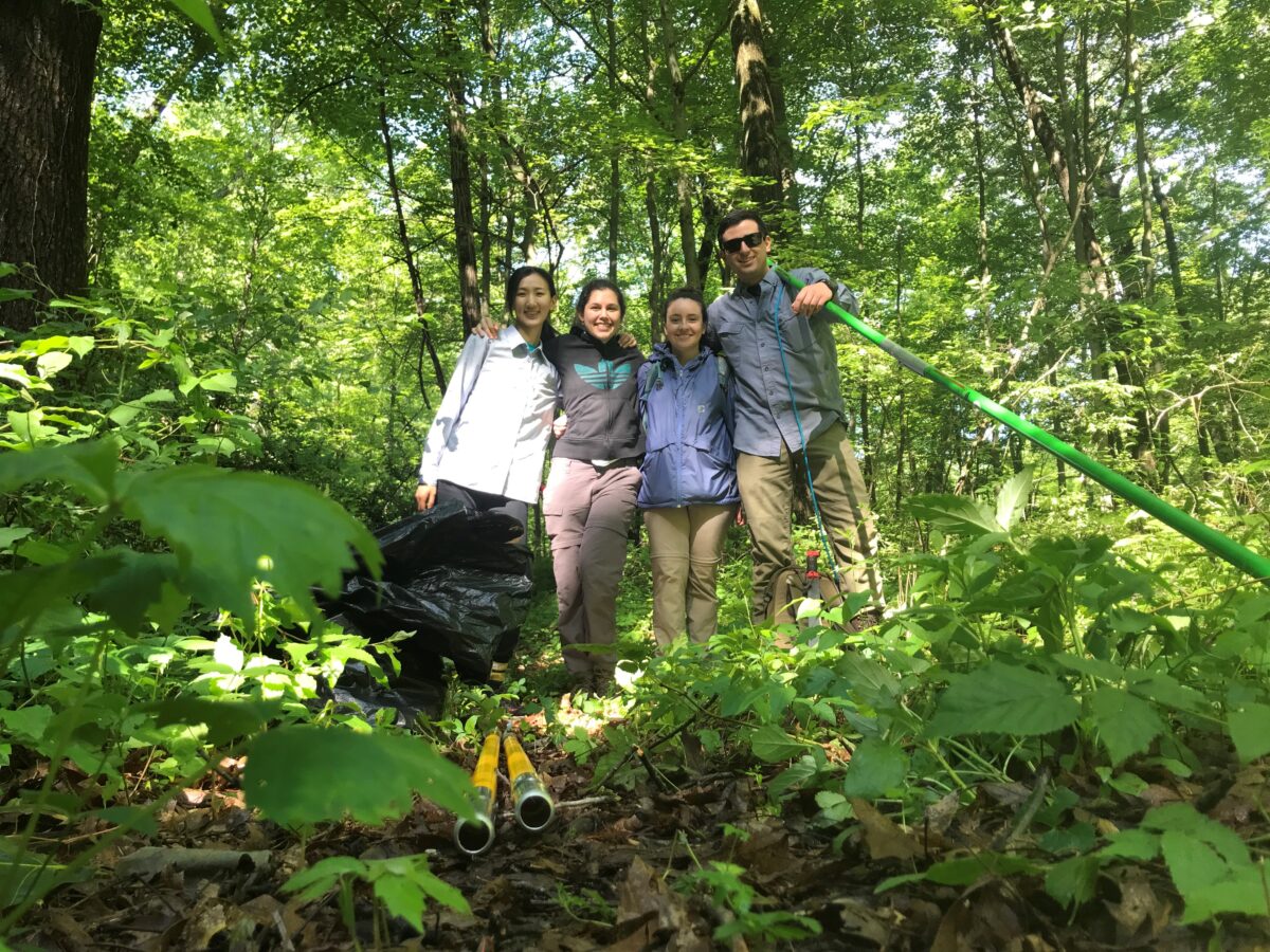 The teamwork at the Big Woods Plot, Michigan. From left to right Xiaomao Wang (Master student at the SEAS, UM), Natalia Umana, Jenny Zambrano and Vincent Battista (PhD student in the department of Anthropology UM).